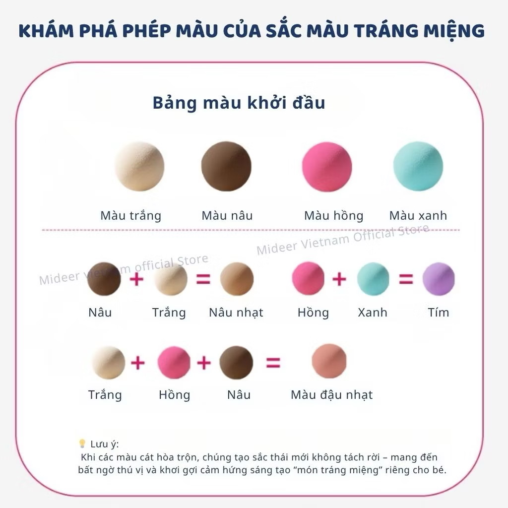 Khi các màu cát hòa vào nhau, chúng tạo nên sắc thái mới không thể tách rời – chính điều đó mang đến bất ngờ thú vị và khơi gợi cảm hứng để bé sáng tạo “món tráng miệng” riêng