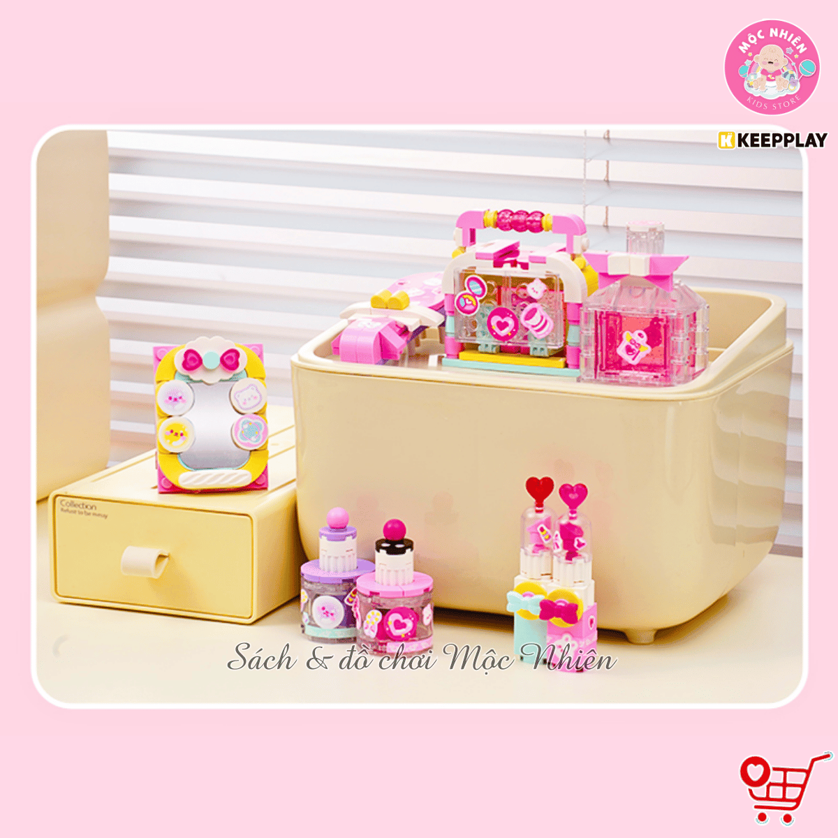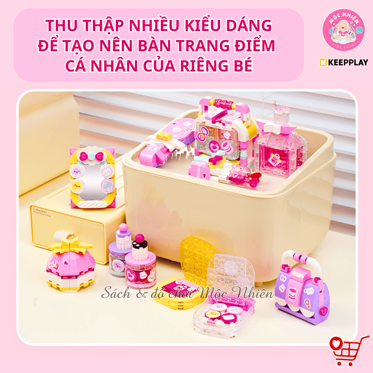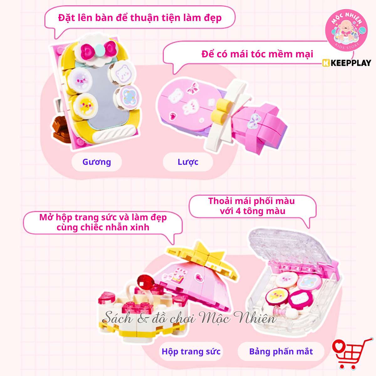 Bộ sản phẩm gồm có 9 hộp nhỏ, mỗi hộp lắp ráp thành một loại trang điểm (như gương, lược, son môi, hộp phấn, sơn móng tay, phấn mắt,...) vô cùng thú vị và đẹp mắt. Giúp bé thỏa sức sáng tạo và trưng bày các món trang điểm lên bàn học của mình và nhập vai chơi với búp bê