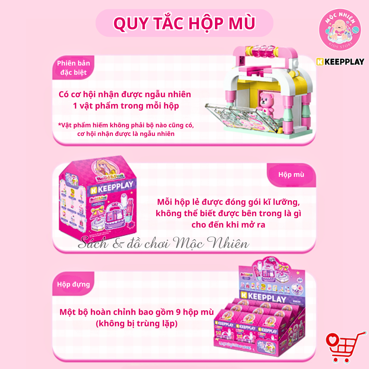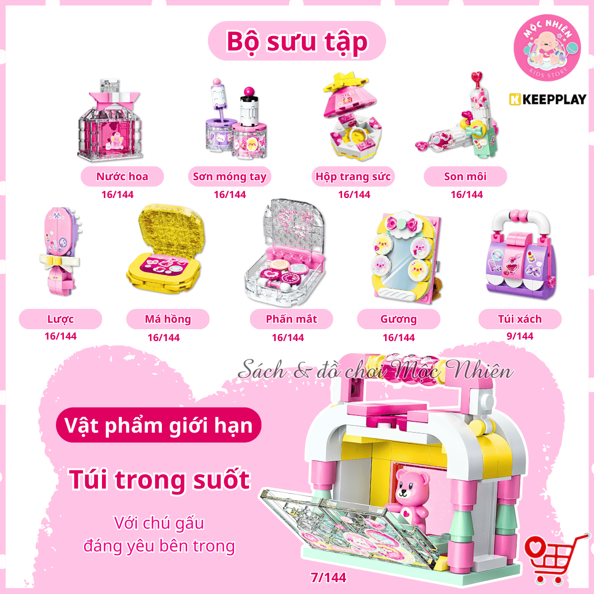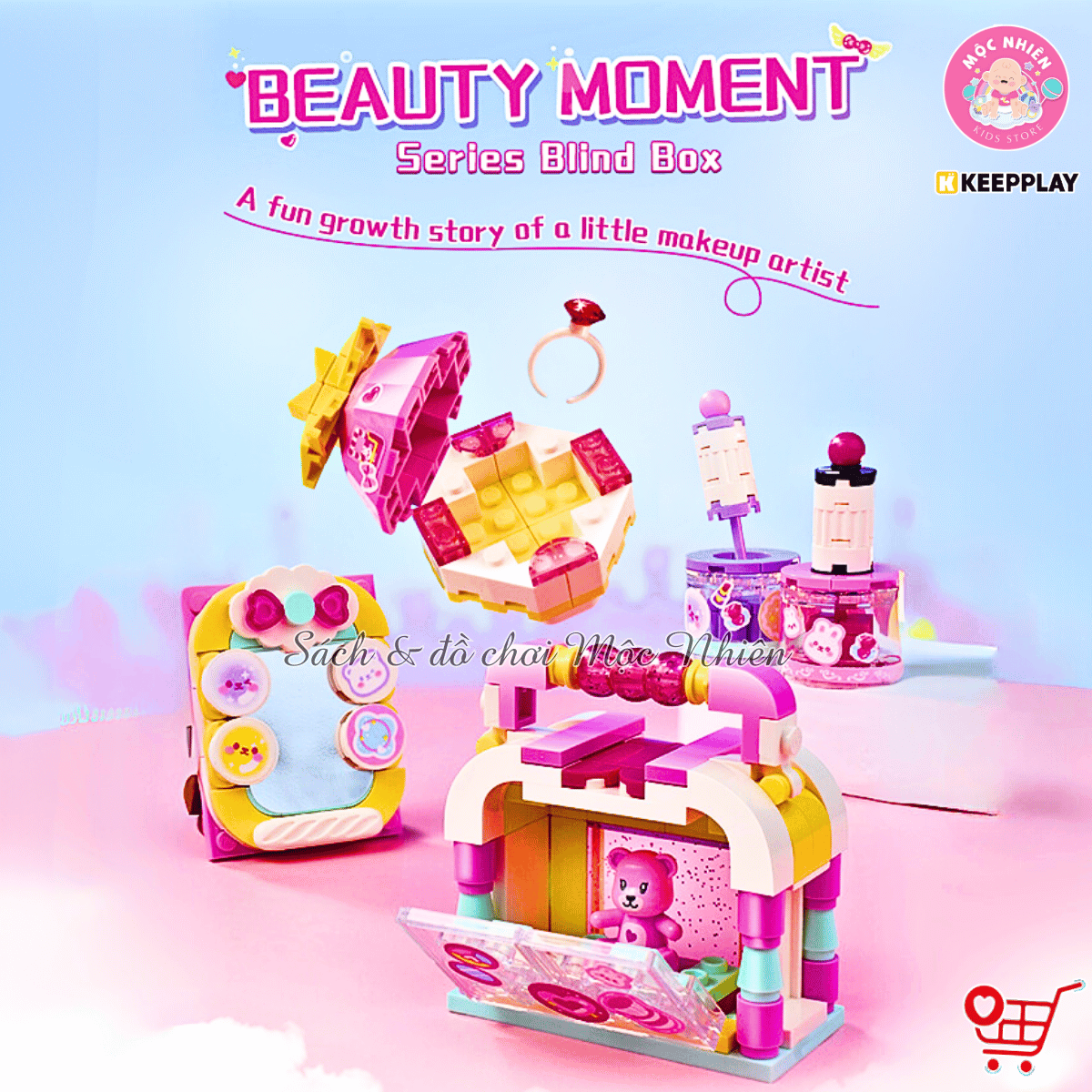 Bộ sản phẩm gồm có 9 hộp nhỏ, mỗi hộp lắp ráp thành một loại trang điểm (như gương, lược, son môi, hộp phấn, sơn móng tay, phấn mắt,...) vô cùng thú vị và đẹp mắt. Giúp bé thỏa sức sáng tạo và trưng bày các món trang điểm lên bàn học của mình và nhập vai chơi với búp bê