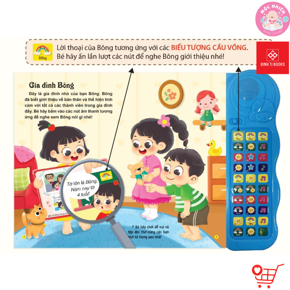 - GIA ĐÌNH: Bé học cách giới thiệu bản thân (Tớ tên là Bông. Năm nay tớ 4 tuổi,...), học cách thể hiện tình cảm với người thân (Con yêu bố! Con yêu mẹ,...)
