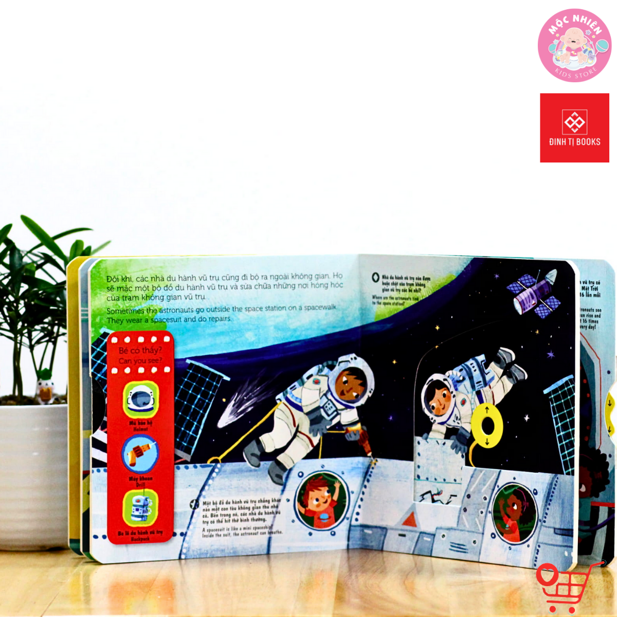 "Sách tương tác - Sách chuyển động - First explorers - Astronauts - Nhà du hành vũ trụ" là cuốn sách đặc biệt